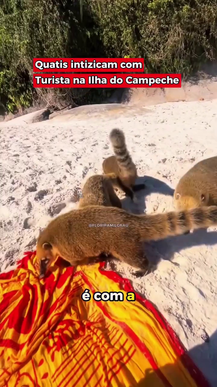 A calmaria da Ilha do Campeche, em Santa Catarina, foi interrompida para uma turista por uma abordagem inusitada. Um grupo de quatis decidiu fazer uma busca minuciosa nos pertences da banhista.