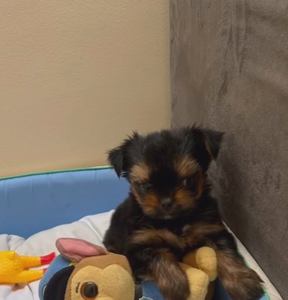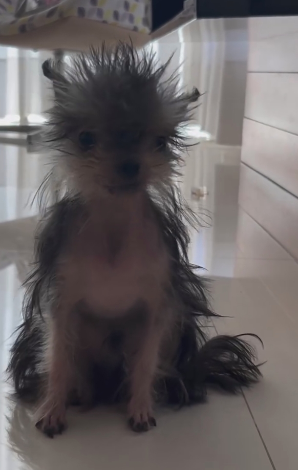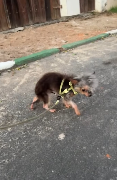 O cãozinho, que parece uma mistura de yorkshire com alguma outra coisa de outro mundo, anda levemente encolhido, tremendo, com um topetinho rebelde e falhas no pelo.