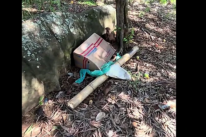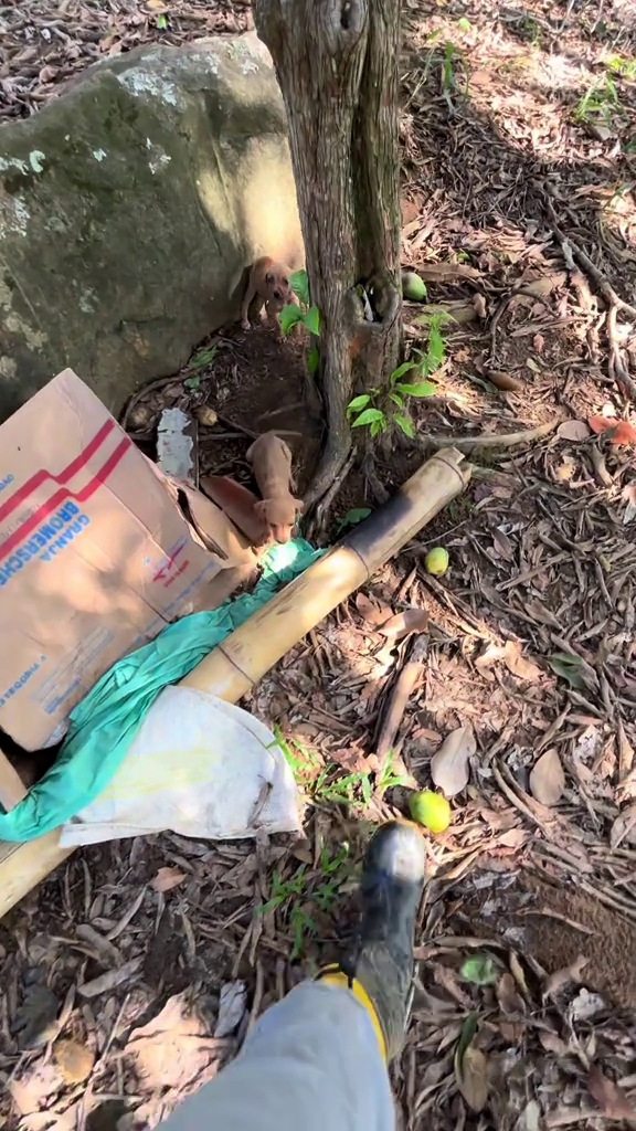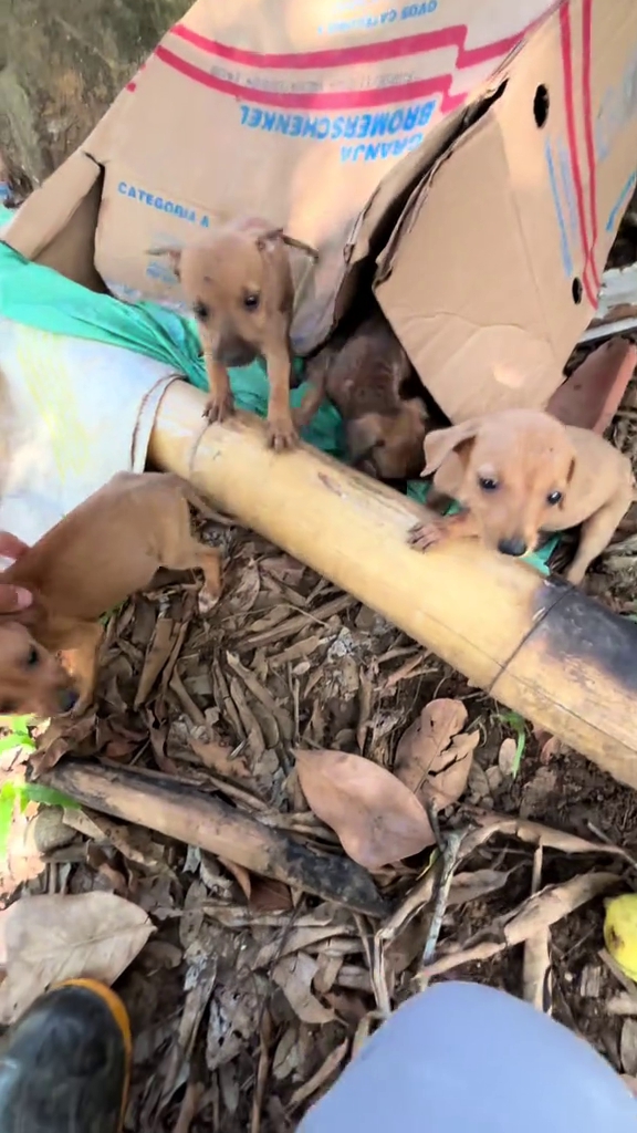 Sob a sombra de uma árvore, Leonardo encontrou quatro filhotes abandonados dentro de uma caixa de papelão desgastada. Eram dois machos e duas fêmeas, extremamente magros, assustados e sem acesso a água ou comida.