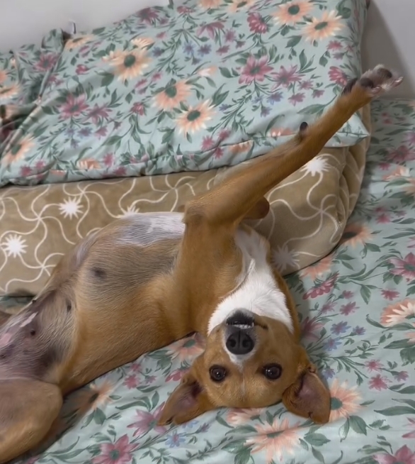 Sol levanta devagar, desconfiada, mas com uma pontinha de esperança, e caminha até o carro. Na sequência, o vídeo corta para o presente: a ex-cadelinha de rua dormindo finamente na cama quentinha, segura e amada.