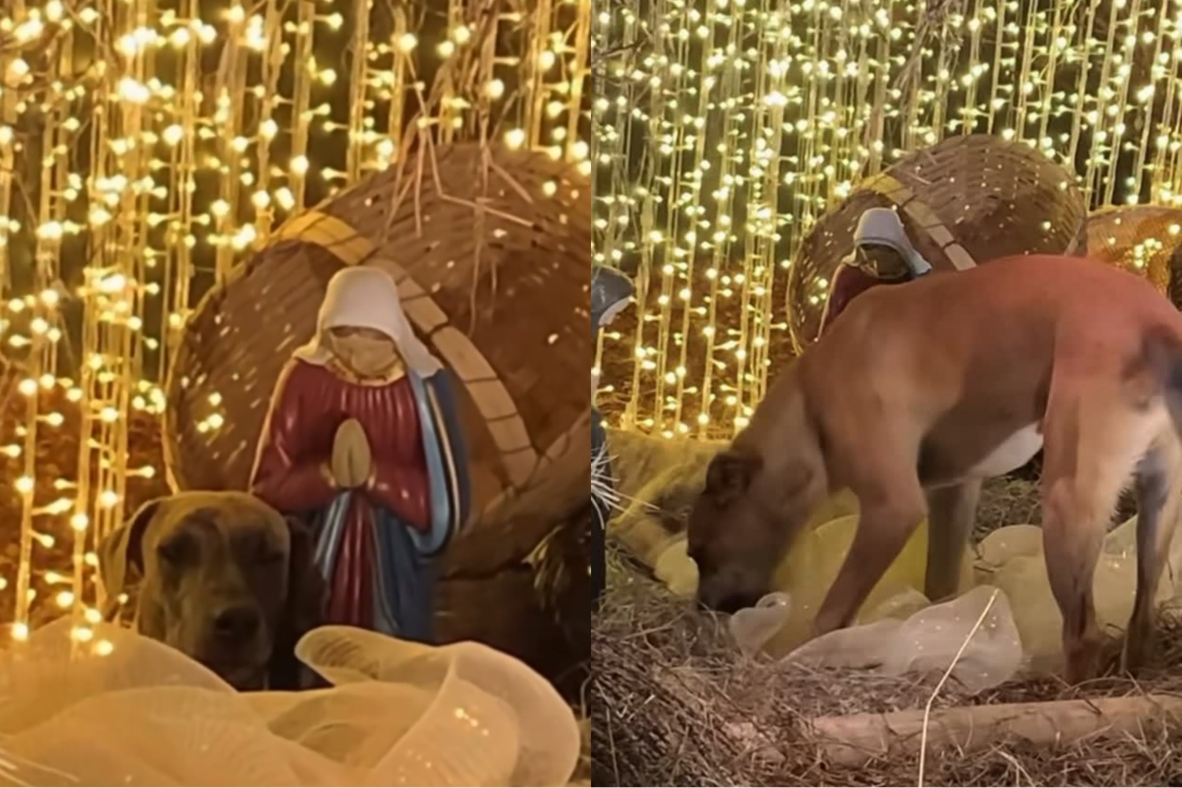 'Os reis magos estão diferentes': Cães caramelo são flagrados buscando abrigo em manjedoura e cena encanta