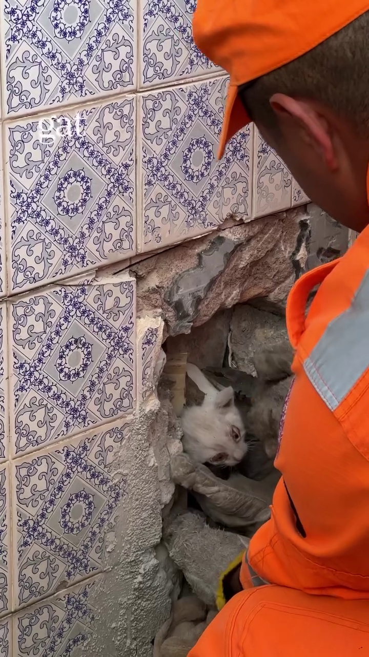A equipe precisou quebrar a alvenaria para acessar o cano e retirar a gata com segurança.