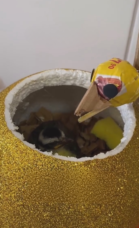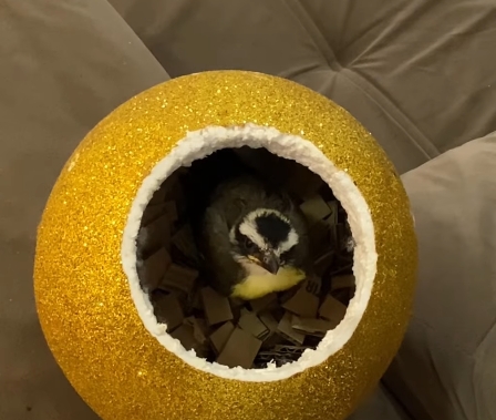 Com o passar das horas, Paulo usou e abusou da criatividade. Para substituir o ninho perdido, Paulo cortou ao meio uma bola de Natal brilhante e dourada e colocou um forro macio.