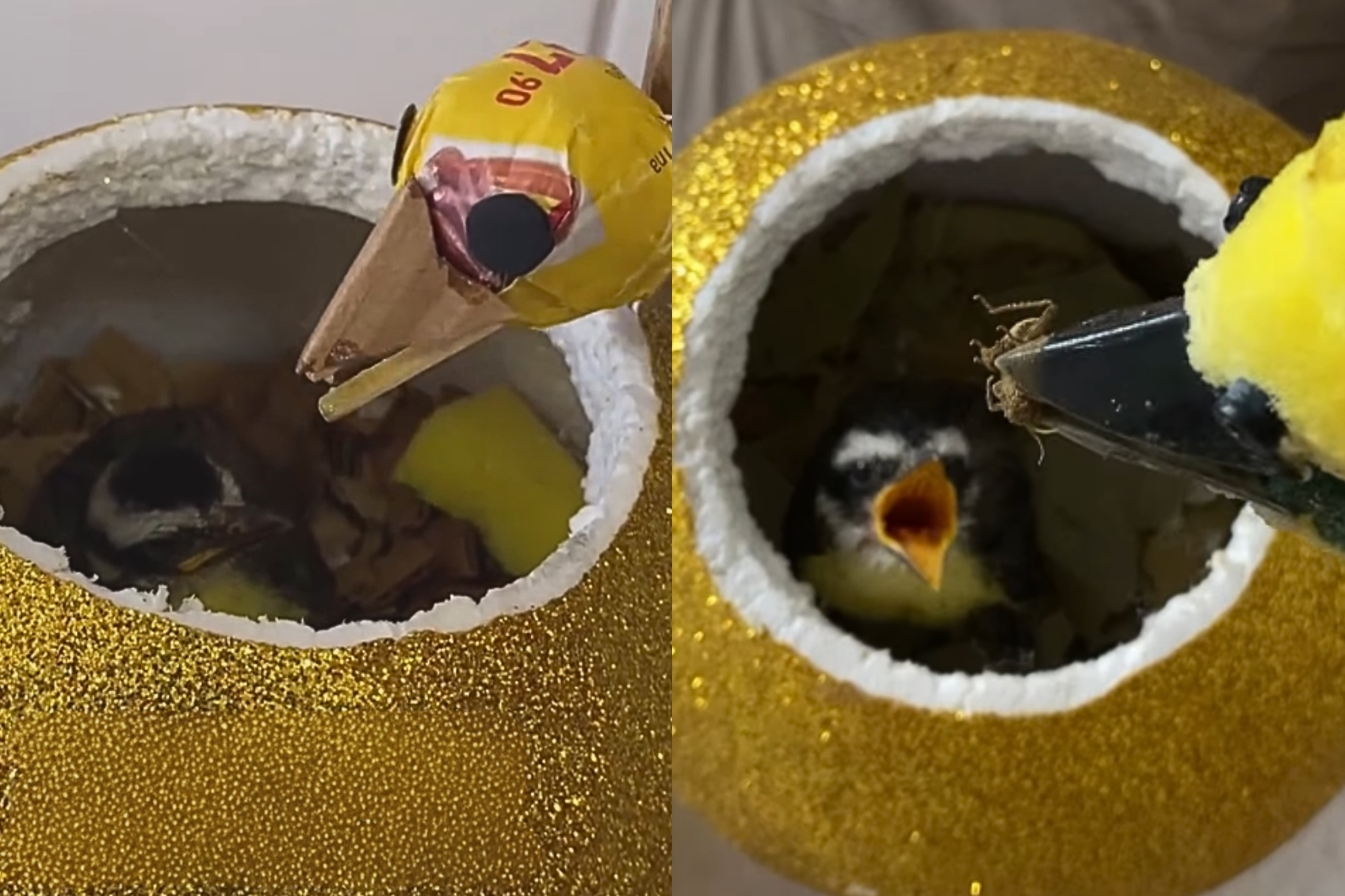 Mas o que realmente dominou as redes sociais foi a engenhosidade que ele usou para alimentar o filhote: uma mãe bem-te-vi de papelão.