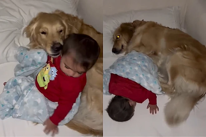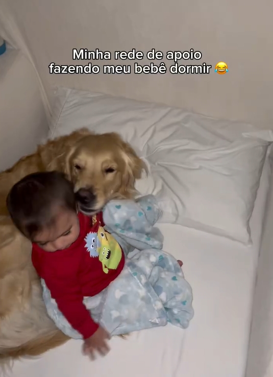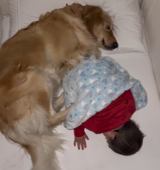 Cachorra Golden amorosa vira “rede de apoio dourada” e ajuda bebê a dormir de um jeito que derrete corações