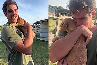 Antes mesmo de segurar o animal nos braços, a ansiedade e a felicidade do ator já eram visíveis. Ao receber a pequena cadela das mãos de uma voluntária, Bruno não conseguiu conter as lágrimas.