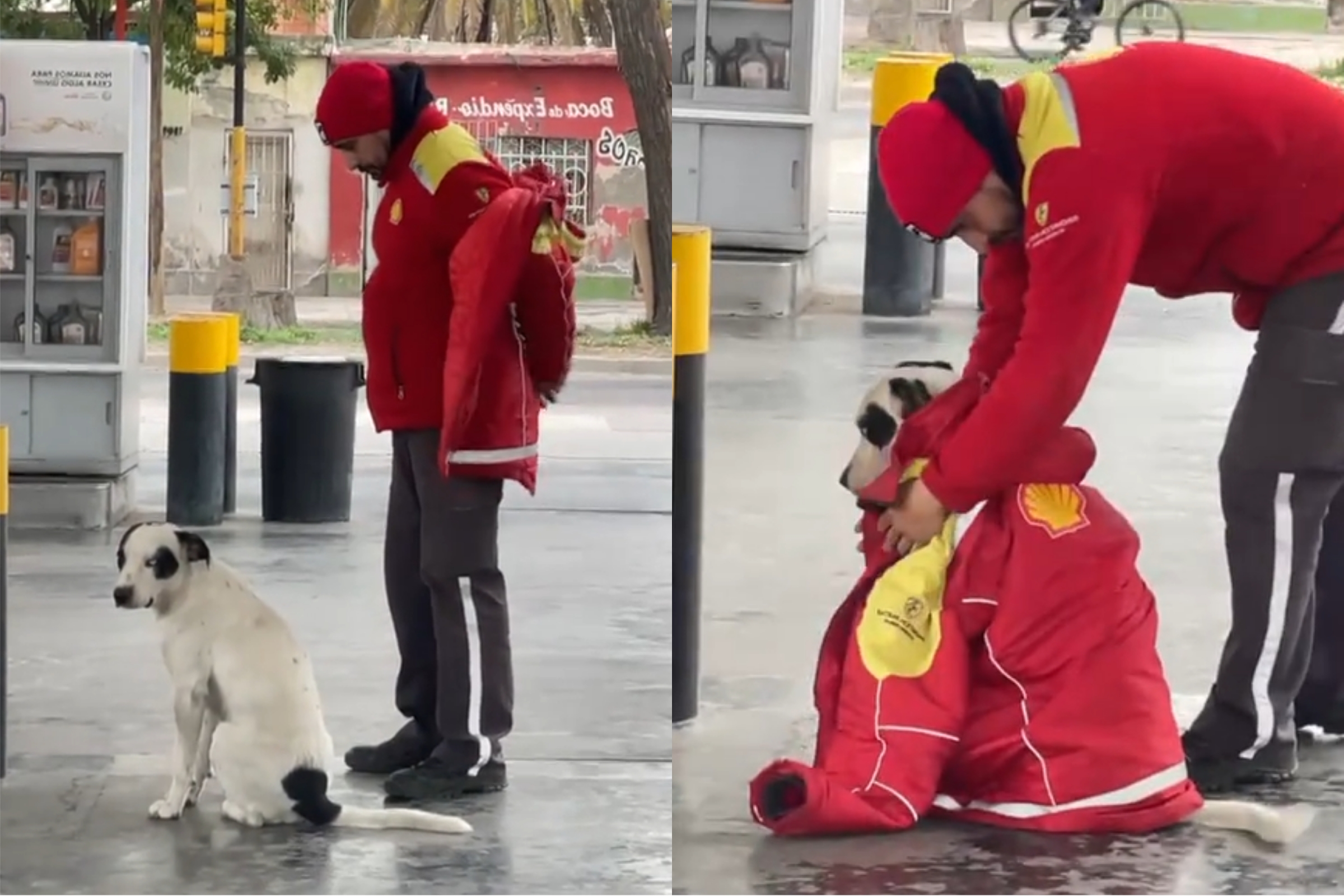 'Atitudes que inspiram': Em dia frio, frentista é flagrado tirando o próprio casaco para aquecer cão vira-lata