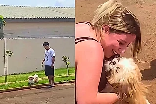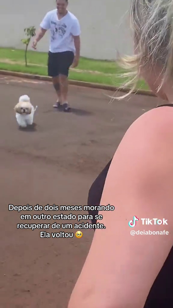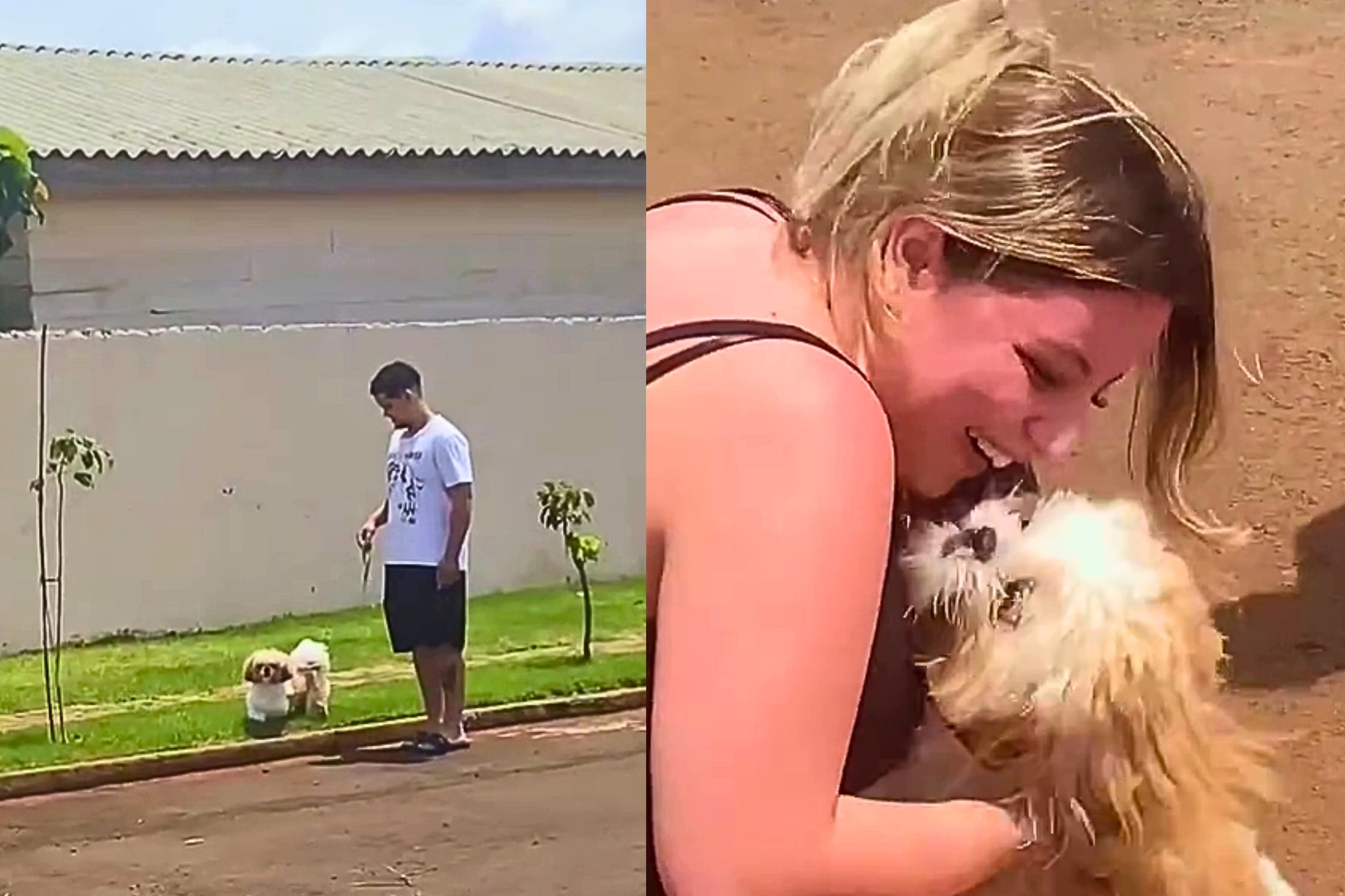 Em poucos instantes um rapaz surge trazendo a cachorrinha na coleira. A reação é imediata assim que o animal identifica a silhueta familiar. O shih-tzu corre em direção à tutora puxando a guia com força e demonstrando total reconhecimento.