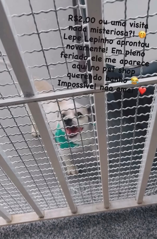 No vídeo compartilhado, Gra escreveu: “Lepe Lepinho aprontou novamente! Em pleno feriado ele me aparece aqui no pet shop querendo banho. Impossível não amar.”