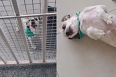 E enquanto ela tentava entender como um cão tão determinado aparece no pet shop fechado, Lepe rolava no chão, animado, como se fosse o dono do estabelecimento.