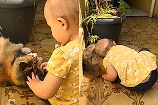 A cena continua e vai ficando ainda mais fofa. A menininha passa a mão com delicadeza no pelo da gata, encosta o rosto, dá beijinhos, abraça de novo.
