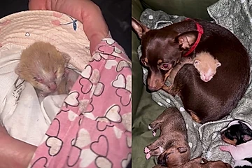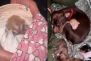 Como o filhote estava claramente em busca de teta, chegando até a tentar mamar na própria Olívia — que até deixou — Alice teve uma ideia iluminada. Poucos dias antes, sua cachorrinha Mavi, da raça pinscher, havia dado à luz, e ainda estava amamentando seus bebês.