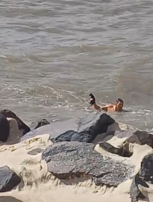 Sem hesitar e consciente dos riscos, ele entrou na água agitada, enfrentando a força das ondas e o impacto constante contra as pedras. Cada movimento exigia atenção redobrada, equilíbrio e coragem. O objetivo era claro: alcançar o felino antes que fosse tarde demais.