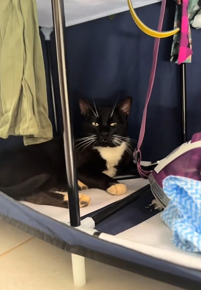 Em um dos momentos mais tensos, o gato, percebendo que estava encurralado, correu para trás de uma cadeira.