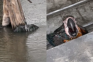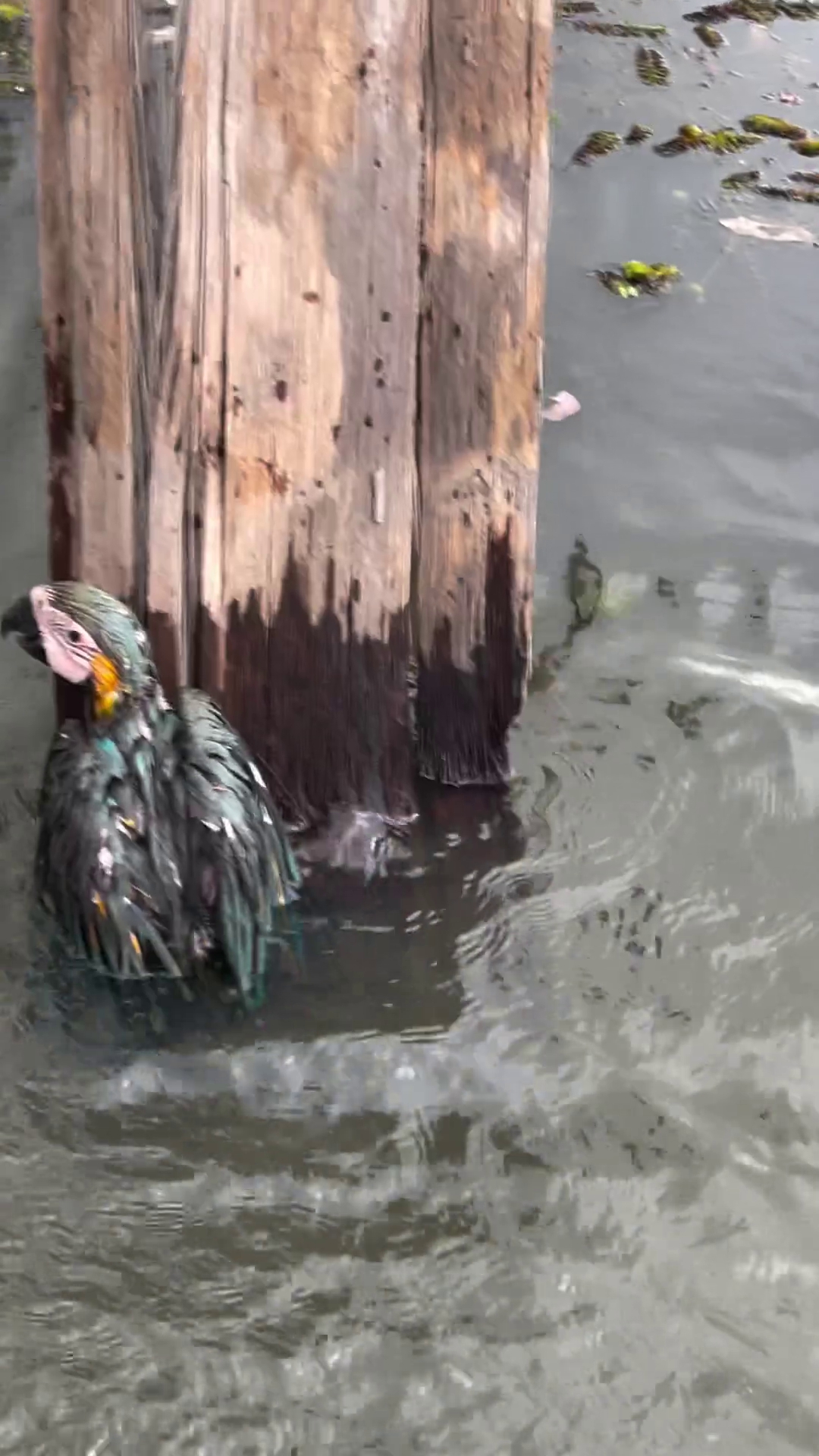 É um filhote de arara, com as penas ainda em formação, lutando contra o afogamento após uma queda de um ninho a metros de altura. O que você faria?