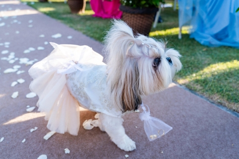 A shih-tzu usava um vestidinho delicado, os pelos estavam perfeitamente arrumados e as alianças estavam guardadas com todo cuidado em um saquinho, preso à roupinha.