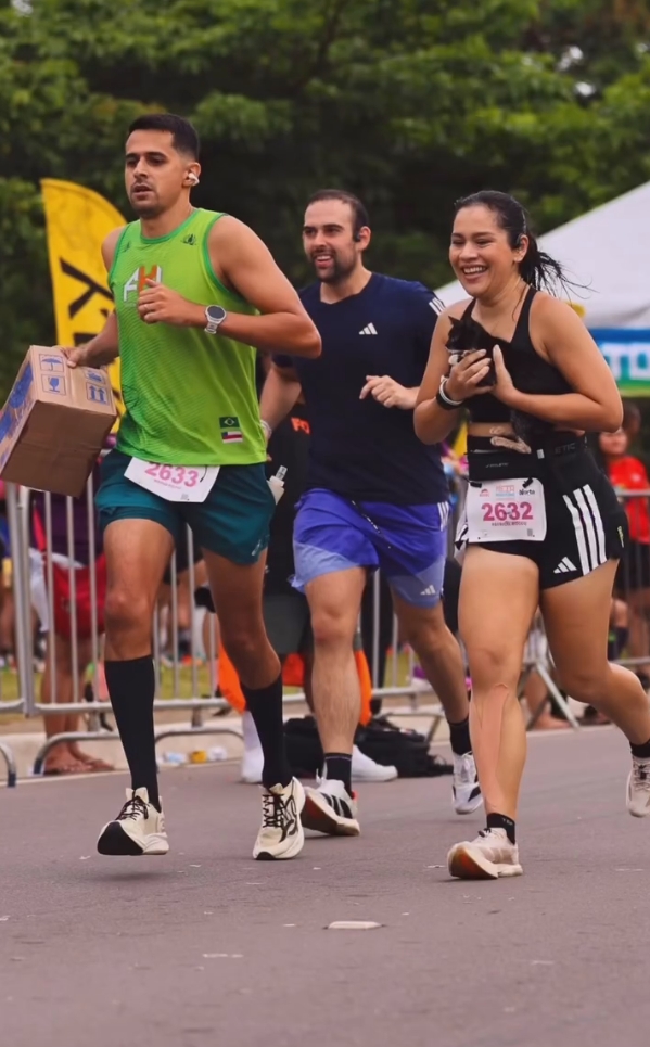 “Achei no meio da pista. Ia ser atropelado”, contou no vídeo em que aparece correndo com o filhote nos braços, tentando equilibrar o ritmo da prova com o cuidado de não assustar ainda mais o novo companheiro.