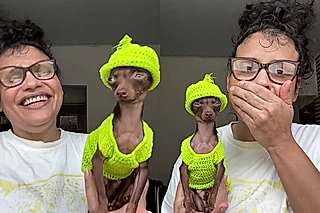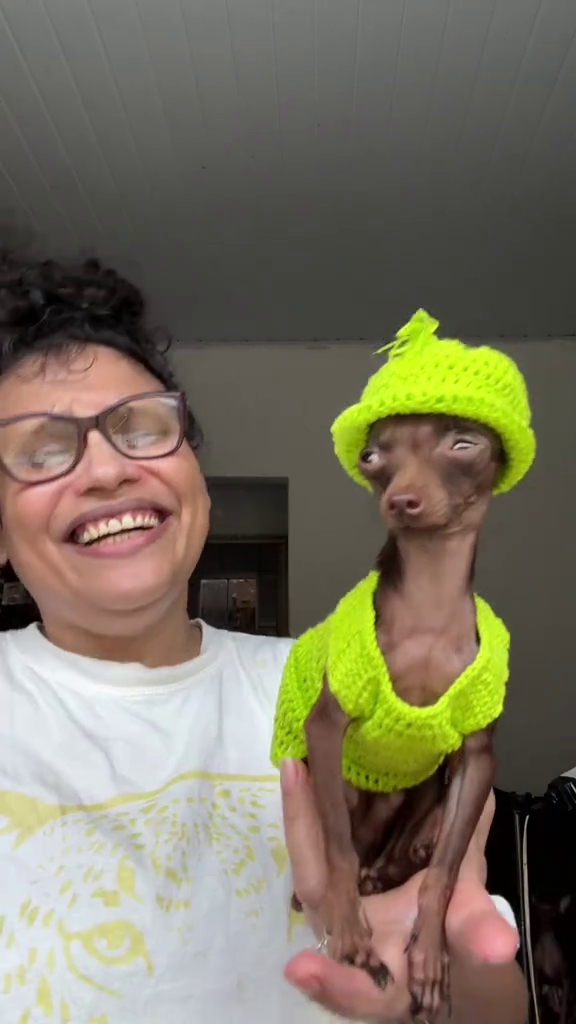 O vídeo, que já ultrapassa a marca de 45,2 milhões de visualizações, mostra o pequeno animal vestindo um conjunto de crochê em tom verde neon que transformou o figurino festivo em um fenômeno de humor involuntário.