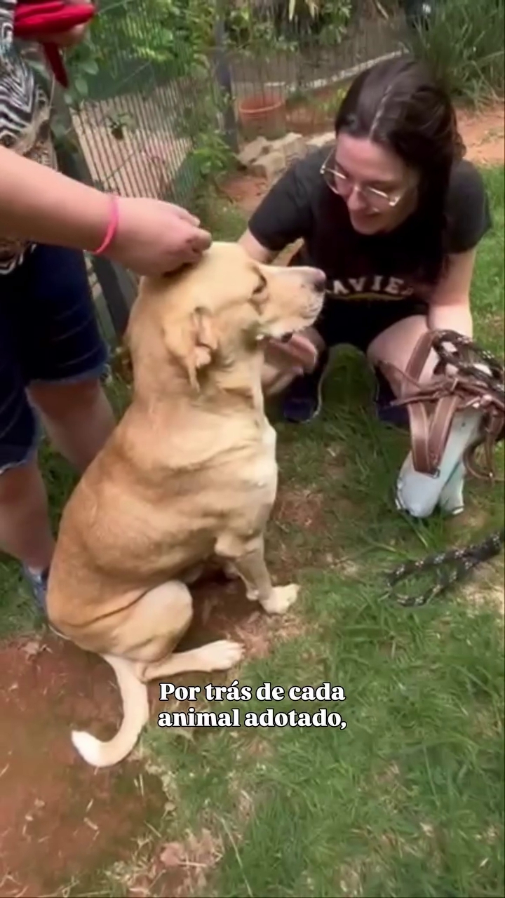 No momento em que recebia a guia para seguir com a nova família, o cão de pelagem caramelo interrompeu o percurso e retornou para interagir uma última vez com a protetora responsável por seus cuidados temporários.