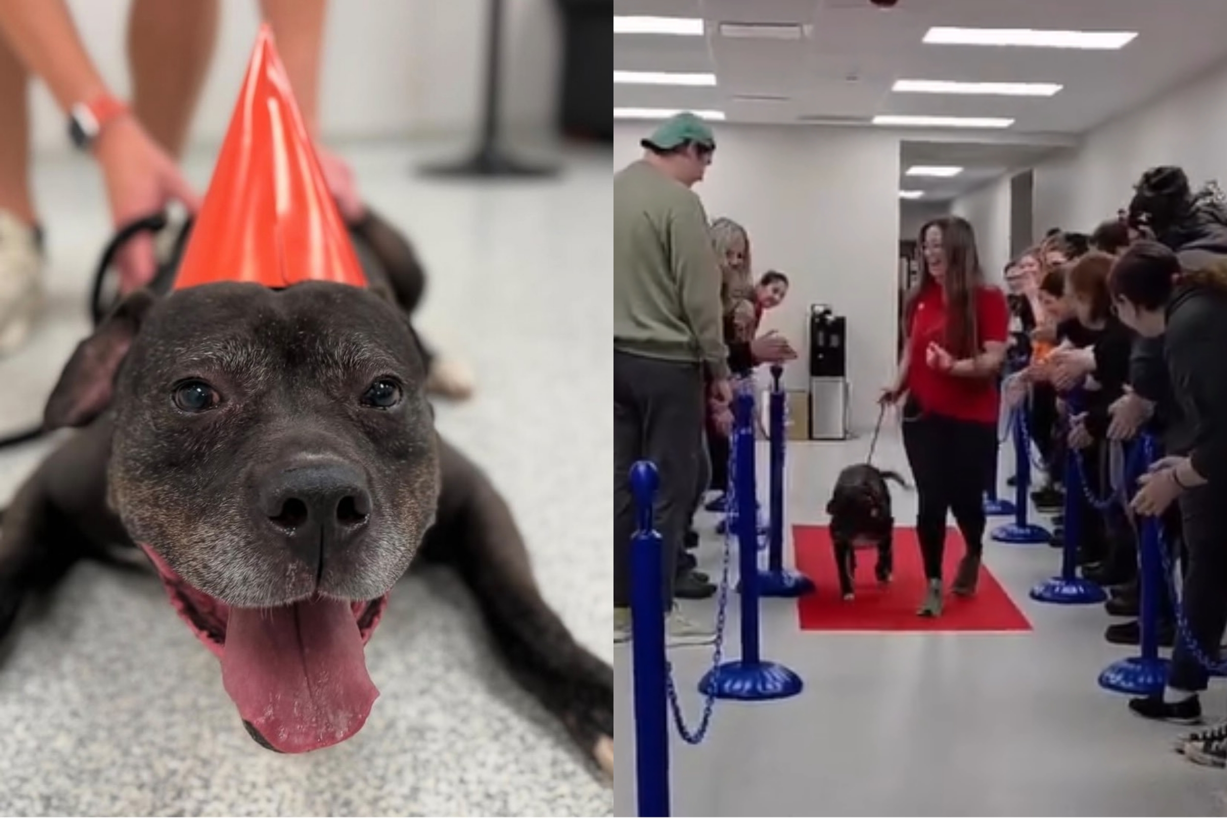 Depois de tantos anos de espera, a equipe do abrigo comemorou a adoção desse lindinho de um jeito especial: com aplausos na recepção, lágrimas de alegria e a certeza de que ele finalmente estava indo para casa.