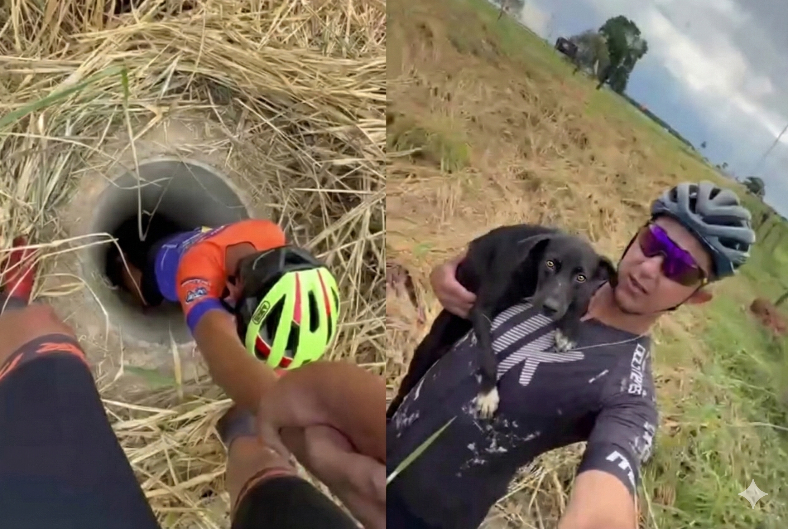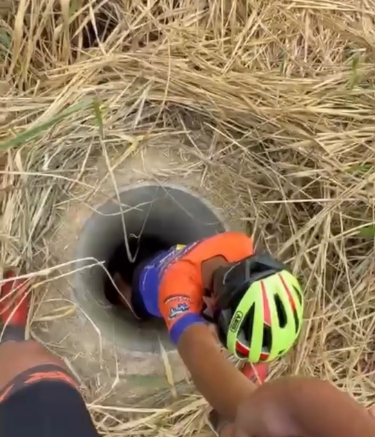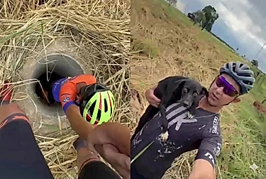 Dentro de buraco no meio do matagal, cachorrinha já estava sem esperanças quando ciclistas escutaram seu pedido de socorro