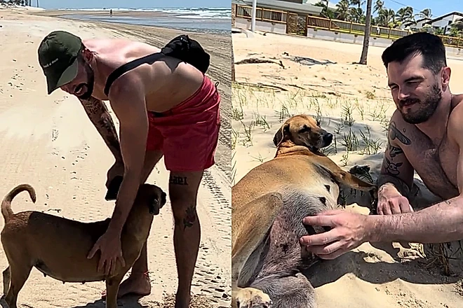 Vira-lata “grávida” pede ajuda a veterinário que passeava na praia, e ele se surpreende ao descobrir que não havia filhotes