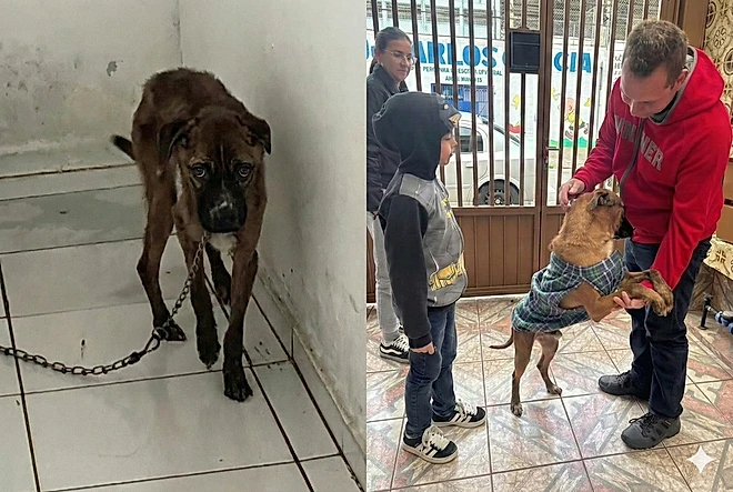 Segundo ela, após o resgate, o cão passou por cuidados veterinários e acompanhamento até estar pronto para algo ainda mais importante: encontrar uma família.