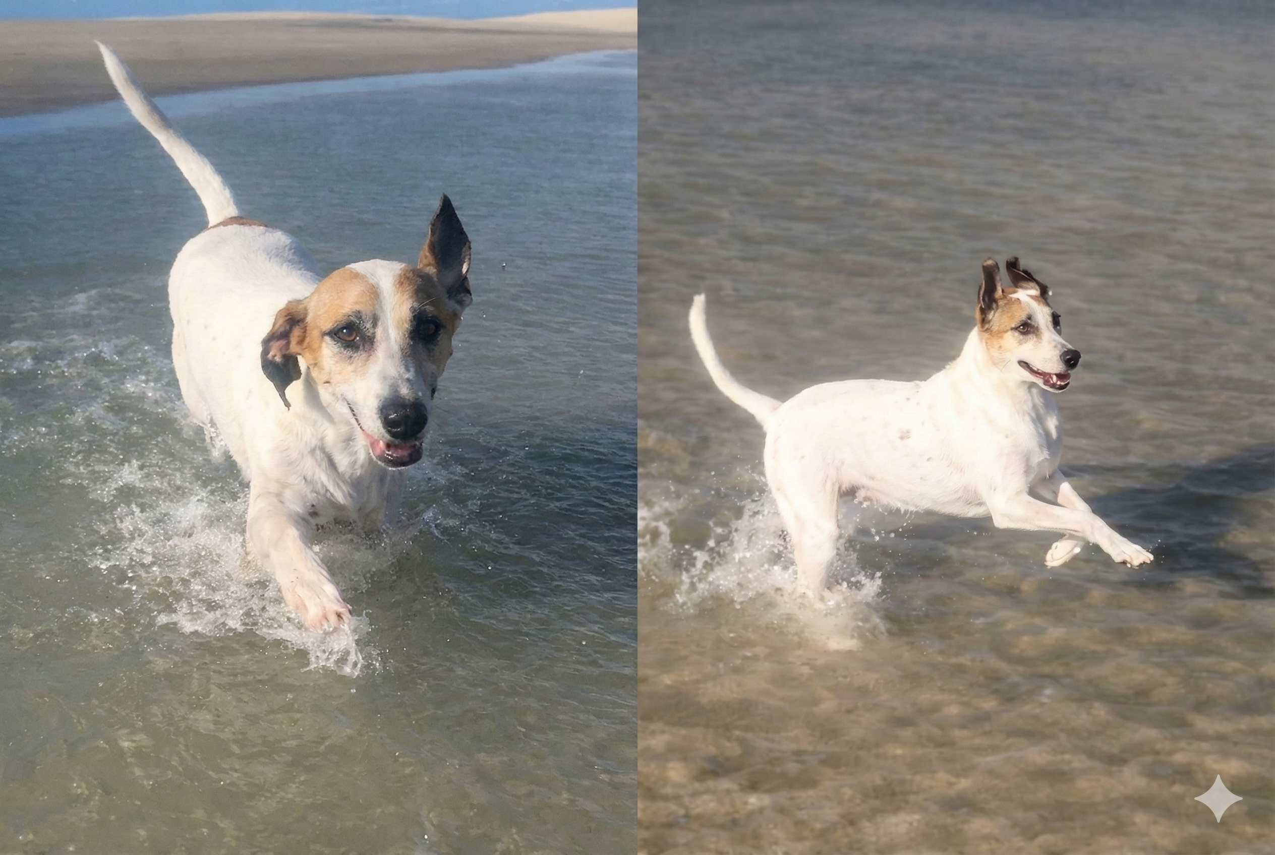 Ainda cautelosa, aproximou-se do mar aos poucos. Primeiro, observou. Depois, colocou as patinhas na água e, quando percebeu que nada de ruim acontecia, passou a correr e pular, tomada por uma alegria difícil de descrever.
