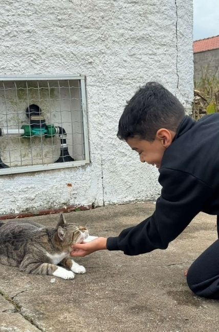 “O Miguel sempre amou animais desde pequeno, mas sempre teve uma ligação muito forte com gatos, chegava a ser engraçado. Em todo lugar que ele ia, os gatos se aproximavam, e ele fazia questão de parar para fazer carinho. Sempre vamos e voltamos a pé da escola e, no caminho, tem vários gatos; ele sempre parava para fazer carinho”, contou Sheila ao Amo Meu Pet.