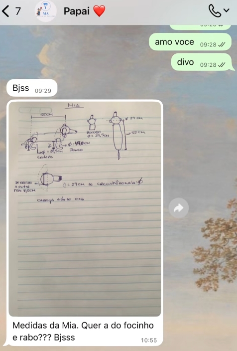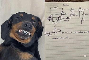 Em vez de apenas números soltos, o pai enviou um levantamento técnico da cachorrinha, com direito a desenhos em perspectiva, medidas detalhadas e anotações dignas de um projeto profissional.