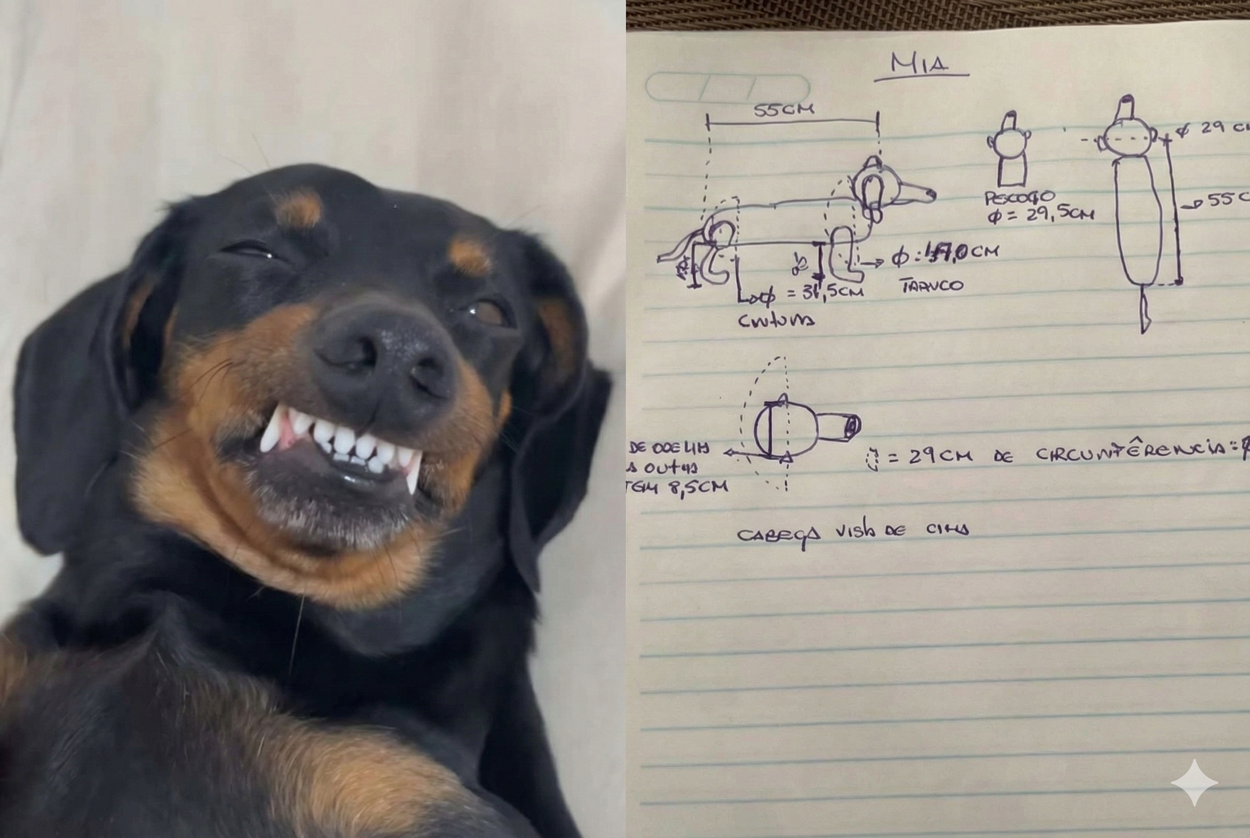 No caderno, estava escrito: “Medidas da Mia”, acompanhado de um desenho em 3D da dachshund, com setas indicando comprimento, altura, largura e outras proporções.