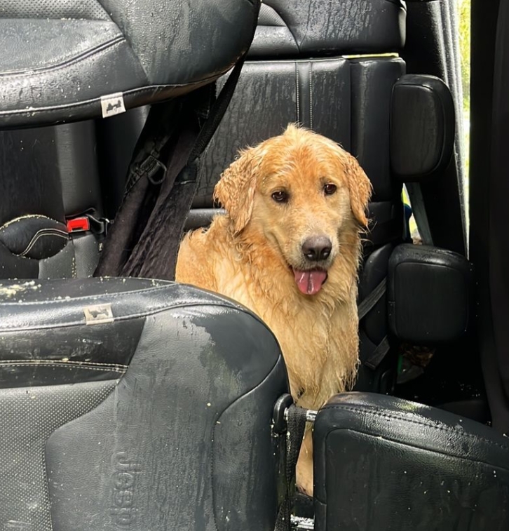 “Ele não se machucou! Nem ele nem nosso gatinho que também estava no carro! Apenas o susto, hoje ele já tomou banho e está brincando novamente.”