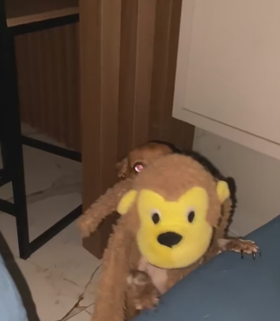 “Quase morri do coração”: Pinscher arma pegadinha para tutora e faz macaco de pelúcia ‘ganhar vida’ ao lado da cama à noite