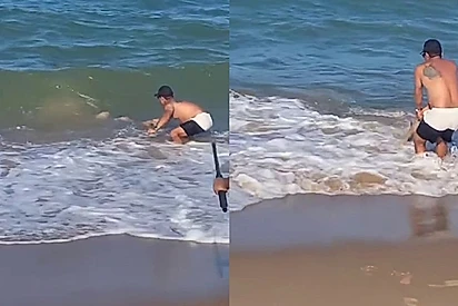 Com paciência, controle e muito cuidado, ele puxou o tubarão até a areia e, sem movimentos bruscos, conseguiu remover o anzol da boca do animal.