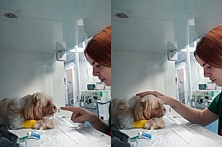 Em outra ocasião, quem roubou a cena foi a cachorrinha Poliana, que estava internada e se recusava a comer a ração — uma situação comum, mas sempre delicada, quando o pet não está se sentindo bem.
