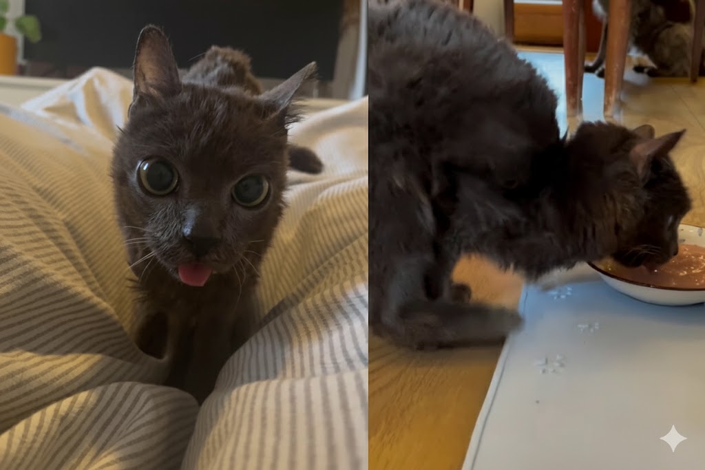 Diante das perguntas, a tutora fez questão de explicar com transparência e carinho. Segundo ela, a alimentação de Blu é adaptada: a comida é triturada, já que a gatinha tem poucos dentes e não consegue mover muito a mandíbula para mastigar.