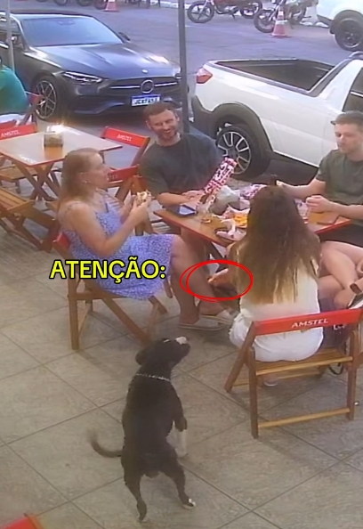 No vídeo, registrado pelas câmeras de segurança, o cachorro se aproxima com cautela. A cliente se distrai por um segundo, com a polenta ainda na mão.