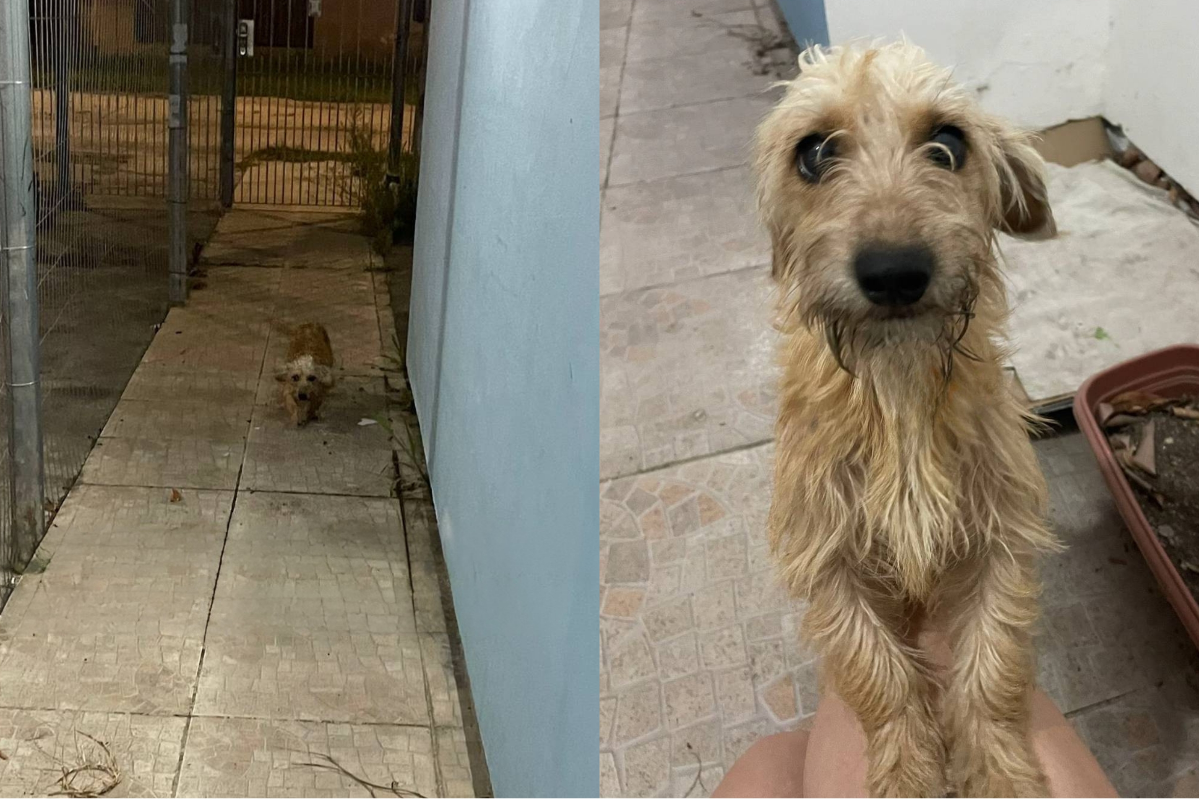 Holly não pediu licença. Aproveitou a chance, entrou devagar e, com o rostinho cansado e sujinho, simplesmente deu um “oi”. Não latia, não corria. Apenas olhava. Um olhar de quem já tinha vivido demais nas ruas e parecia pedir uma chance.
