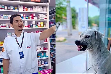 Nas imagens, uma ‘cliente’ questiona sobre a segurança do local enquanto caminha pelos corredores. A resposta vem prontamente do funcionário Rafael Silva, que aponta para a entrada da farmácia e identifica o verdadeiro responsável pela guarda.