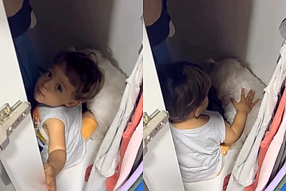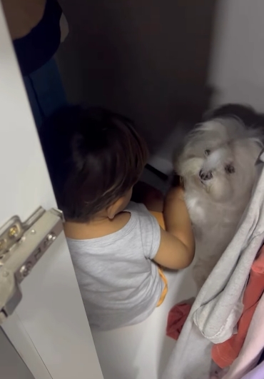 “Já sabe o que é amor”: Assustado com as trovoadas, cão se esconde e menininho entra no armário para confortá-lo com carinho