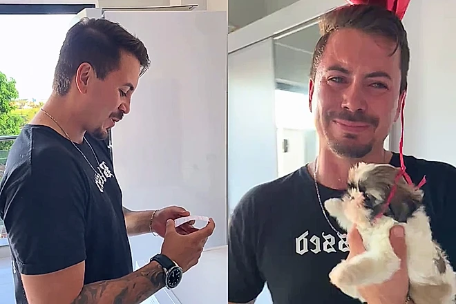 A surpresa foi preparada por Jessica Vidal, esposa de Alexandre, que decidiu transformar o desejo do marido em realidade ao presenteá-lo com uma cachorrinha.