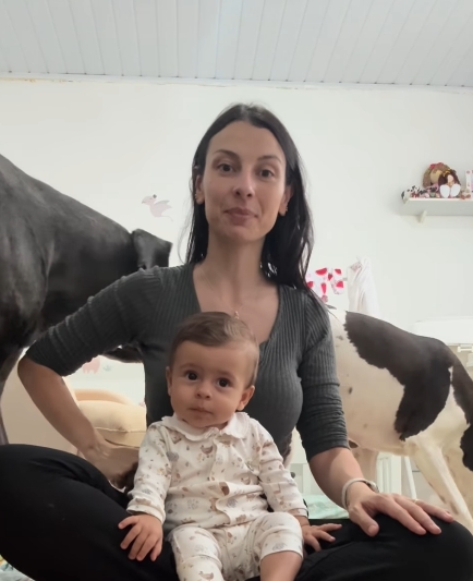 A combinação de um bebê rindo, dois cães gigantes agindo com doçura e uma mãe tentando seguir a trend transformou o vídeo em um momento irresistível.