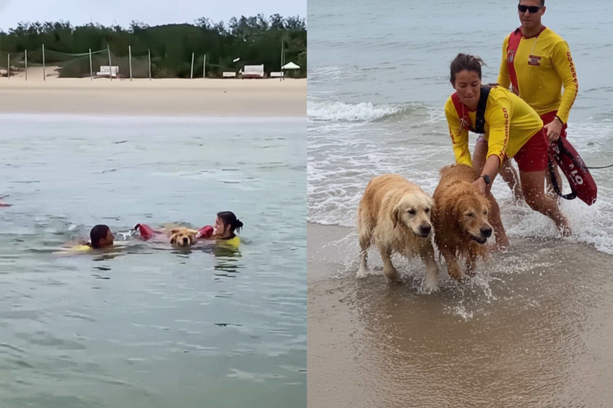 Guarda-vidas percebem comportamento estranho de goldens solitários no mar e começam luta contra o tempo no litoral de SC