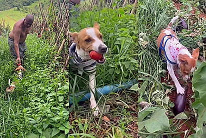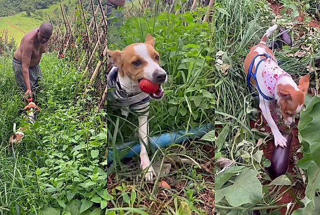 O vídeo compartilhado no Instagram conquistou corações ao mostrar o cão participando ativamente da colheita de tomate e berinjela.