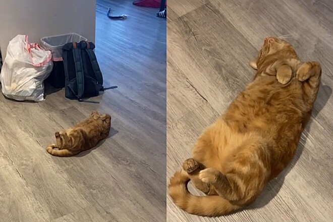 A performance só termina quando a tutora se aproxima. Nesse momento, Macy abre lentamente os olhos e vira a cabeça, como quem diz: “Estou à beira da morte… por petisco.”
