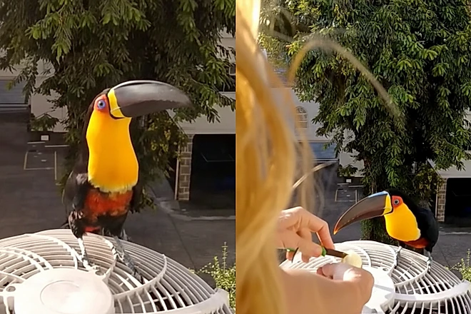 Na janela do apartamento de Jacque, um tucano escolheu fazer seu refúgio.