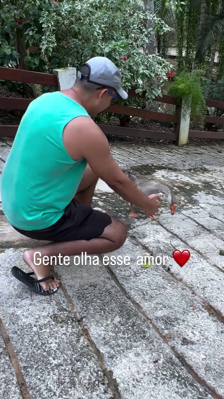 Incentivado pela autora do vídeo, Tatiane Oliveira, o homem começa a chamar pelo ganso. Em seguida o animal aparece em uma parte alta do terreno após ouvir o chamado.