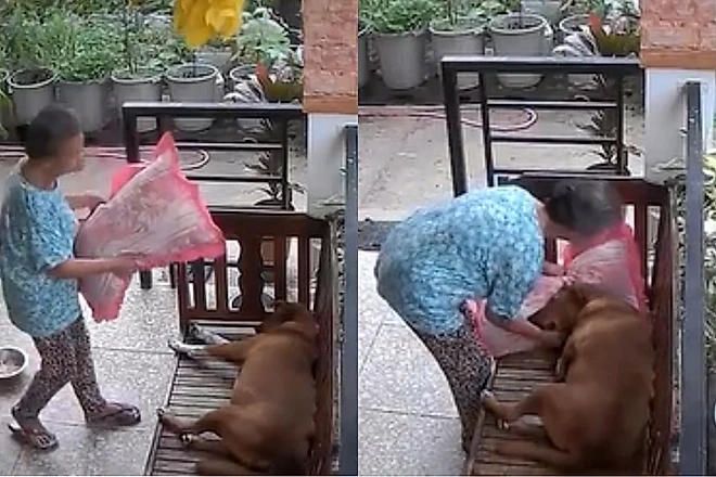 Pouco depois, sua avó aparece na gravação. Mesmo com as limitações da idade e precisando de ajuda no dia a dia, ela se aproxima lentamente do cachorro, carrega um travesseiro e o posiciona delicadamente sob a cabeça do pet, para deixá-lo mais confortável.
