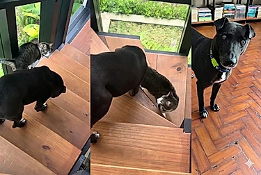 Renata registrou a cena emocionante: o gatinho desce primeiro, degrau por degrau, mostrando exatamente onde o amigo deve pisar. Ele para, observa, espera. Só avança quando percebe que Black está seguro.