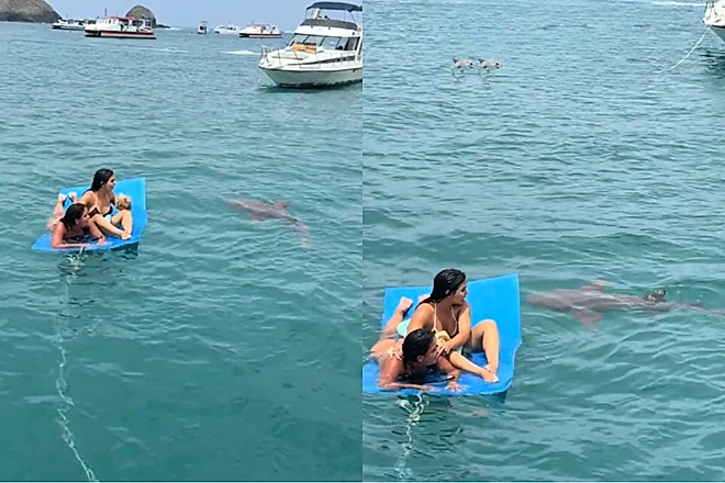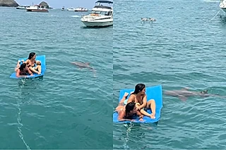As duas entraram na água e permaneceram em uma boia, observando o cenário ao redor. Tudo parecia tranquilo, até que a natureza resolveu surpreender.